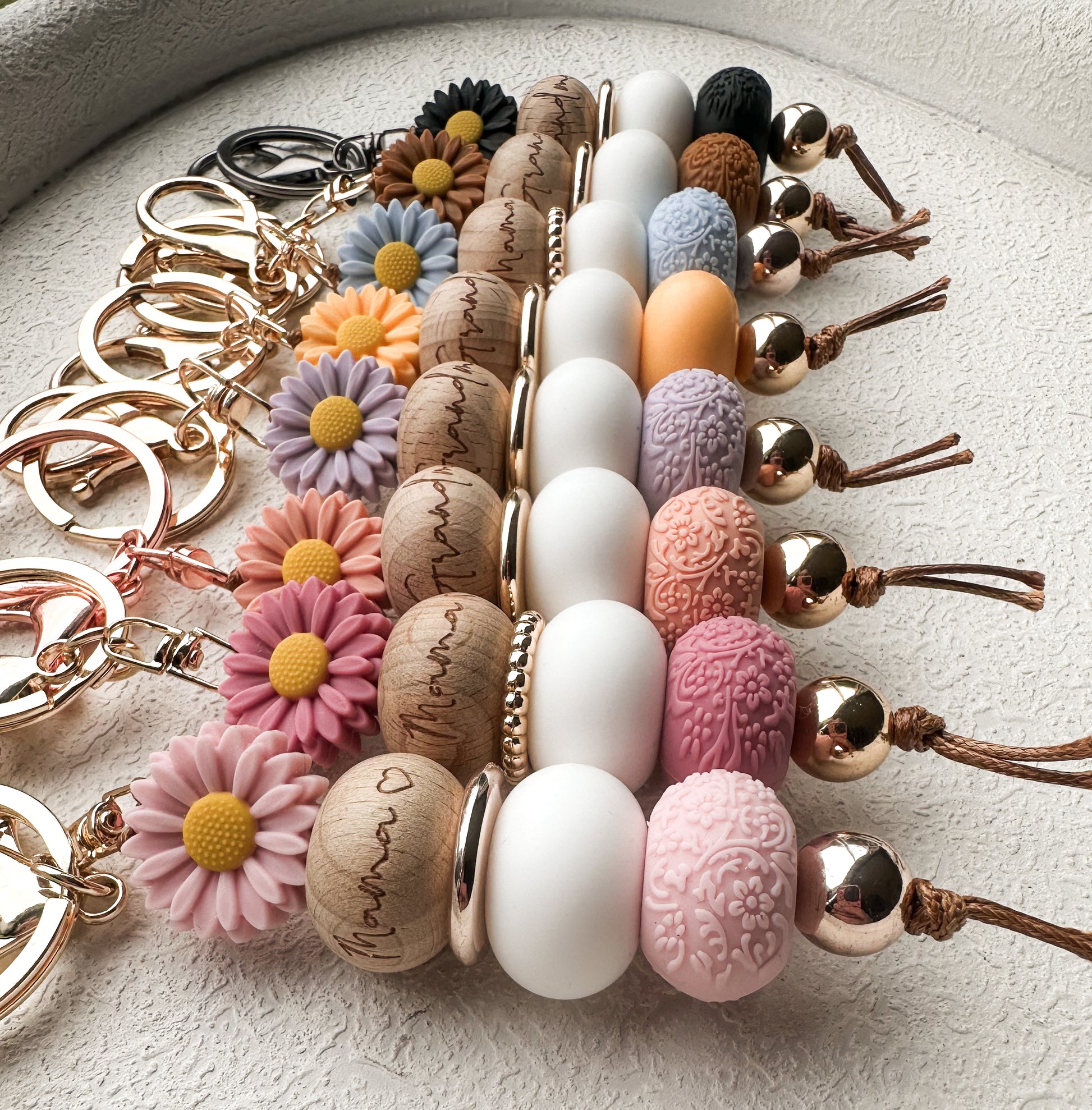 These are our stunning handmade keychains; made from high quality Silicone, acrylic & Beechwood beads.