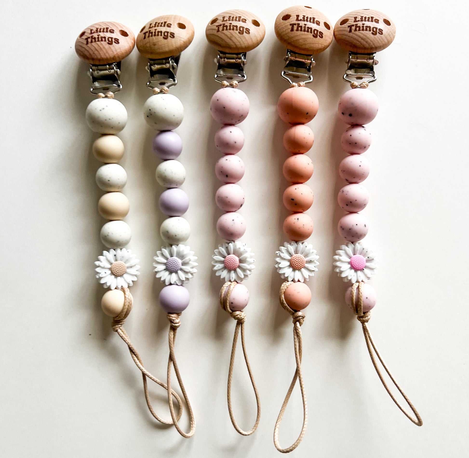 Our mini dummy clips are just right for babies from birth to about 6 months. They're great during those fragile early months when your little ones can't handle longer chains, but you still need a clip to keep those dummy's off the dirty ground!