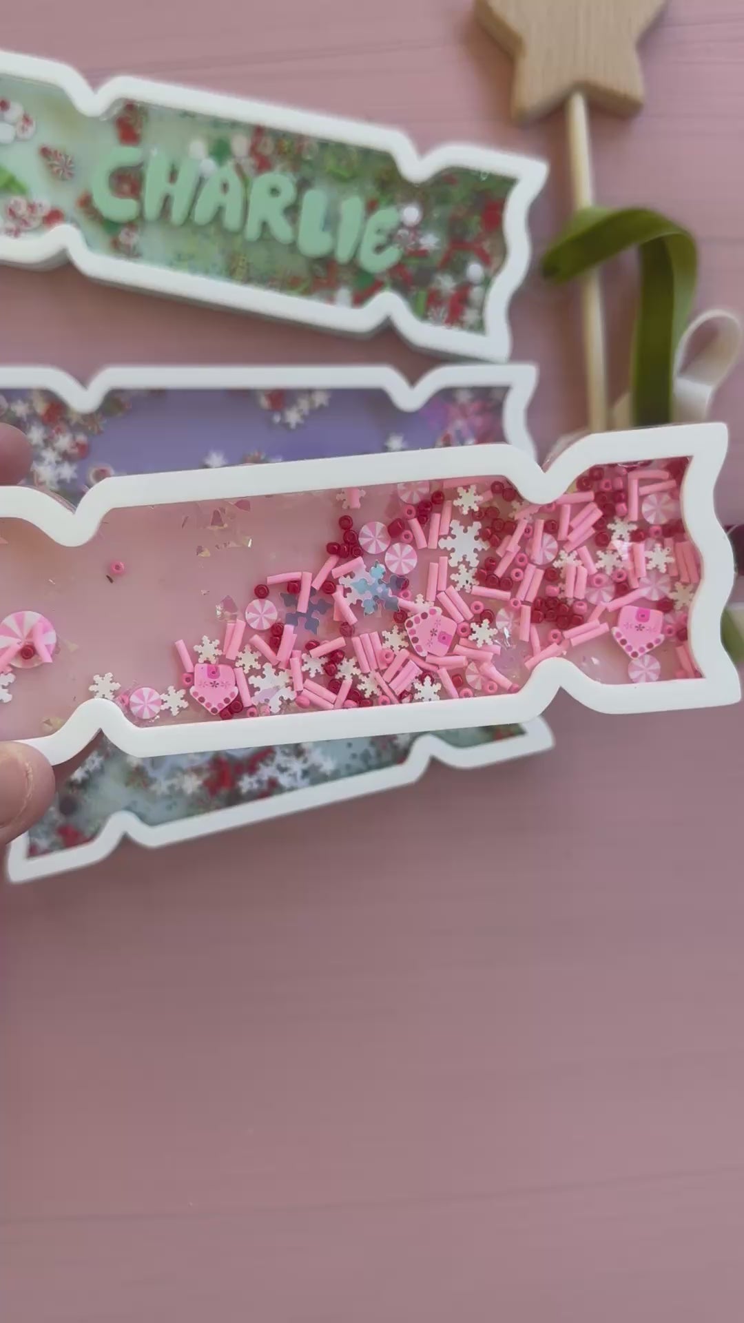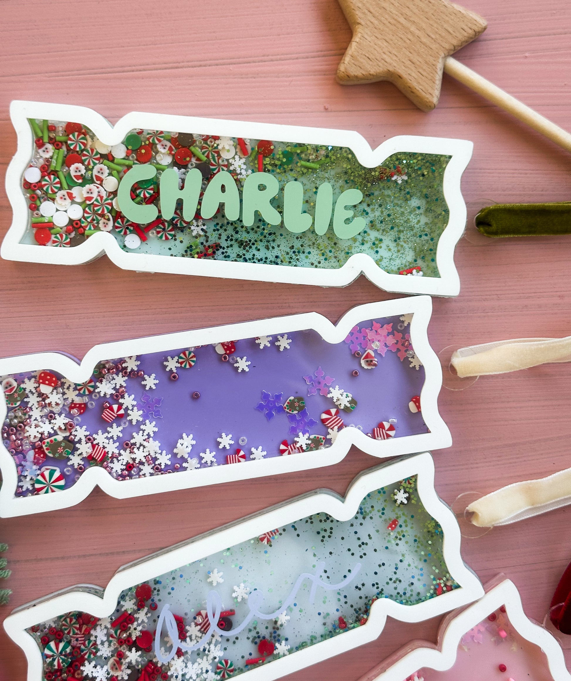 These adorable ornaments are shaped like festive Christmas bon bons and filled with colourful pastel shaker sprinkles, glitter, and Christmas-themed confetti that move and shimmer when shaken. Each one is finished with your choice of name in your preferred font and colour — creating a truly magical and playful keepsake.