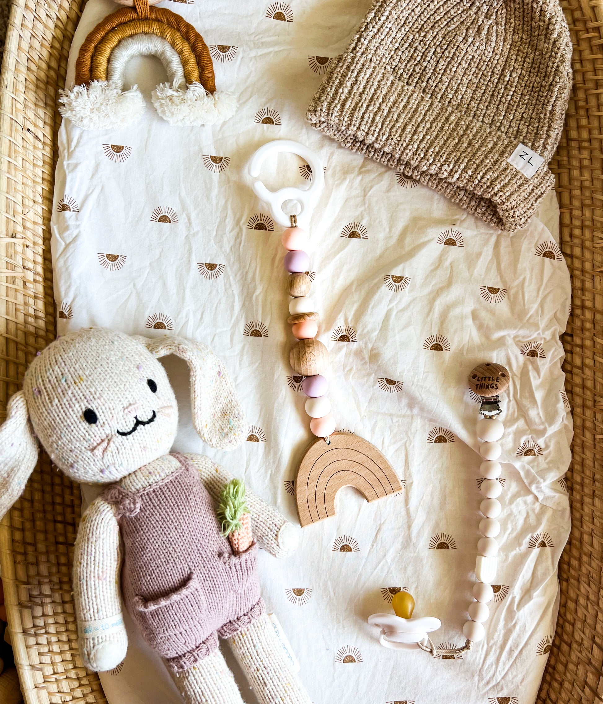Please ensure your child is supervised at all times when using their dummy clip & Teething ring. Babies can inhale, choke or swallow beads if the dummy clip becomes damaged with excess use, therefore this product must be carefully checked over before each use to ensure there is no damage to the clip/chain.