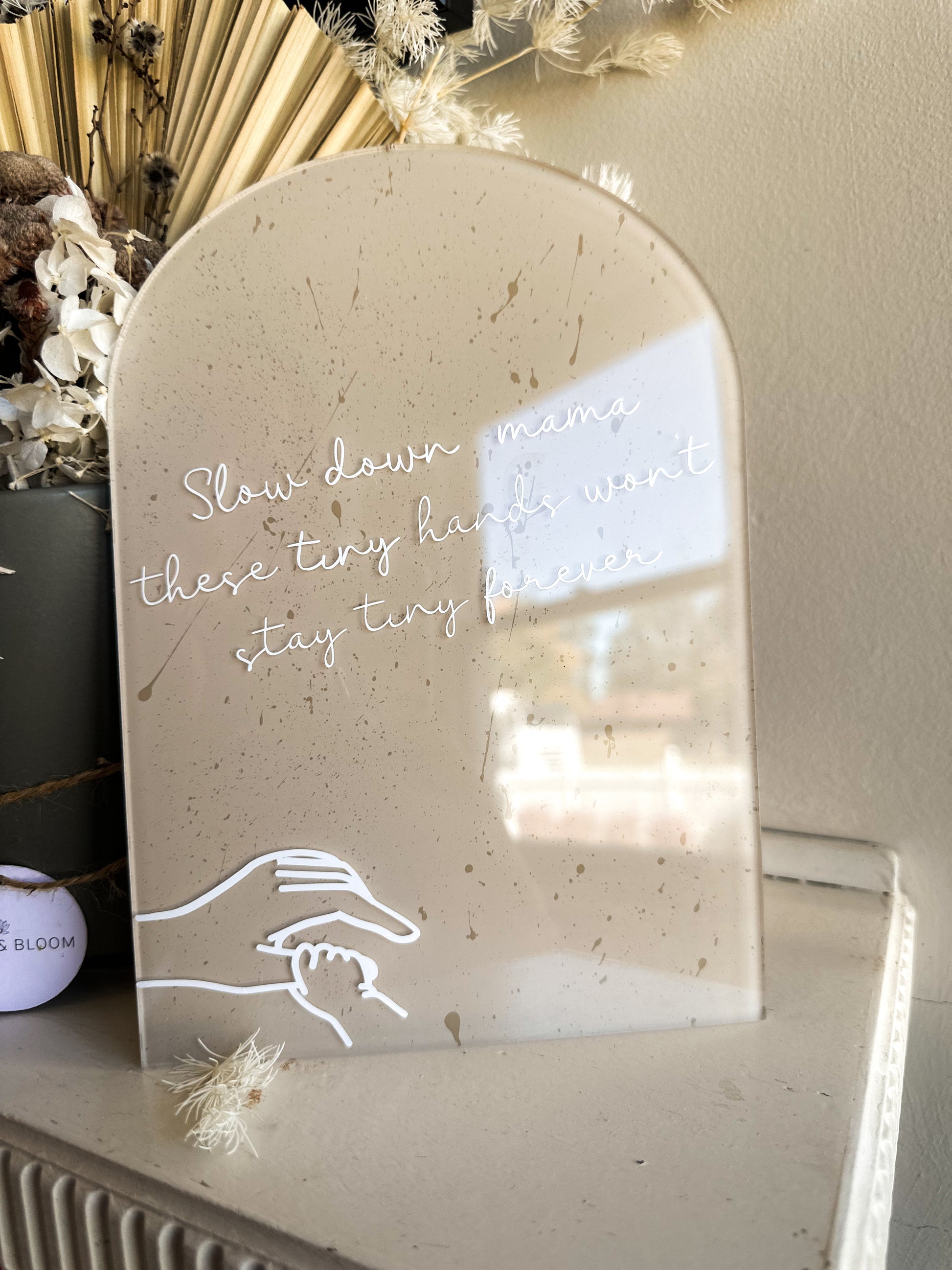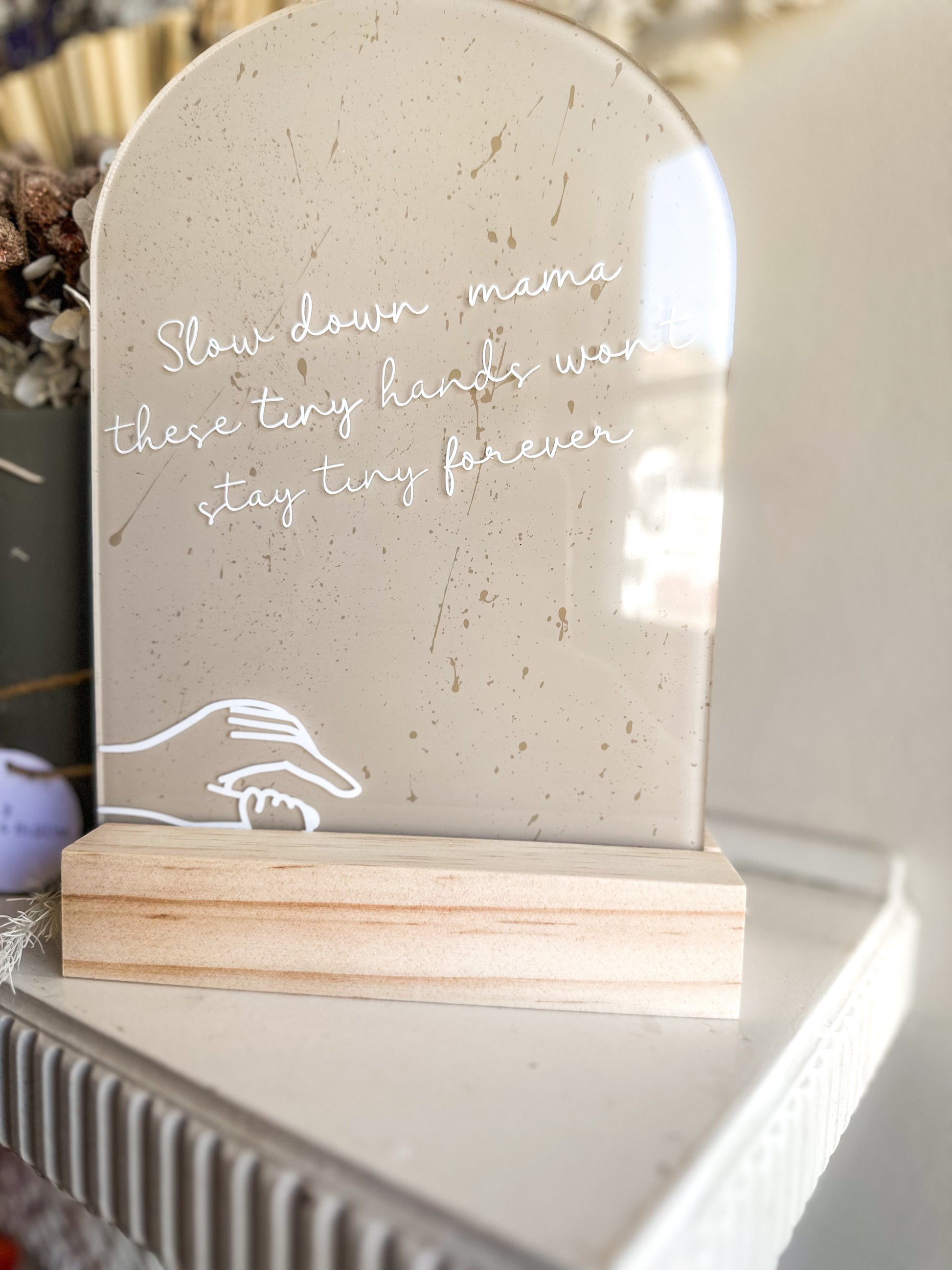 Our “Slow Down Mama, These Tiny Hands Grow Oh So Fast” sign is a beautiful and emotional reminder to cherish the little moments. Designed especially for Mother’s Day, this heartfelt piece speaks straight to a mama’s heart – reminding her that the days may feel long, but the years are oh so short.