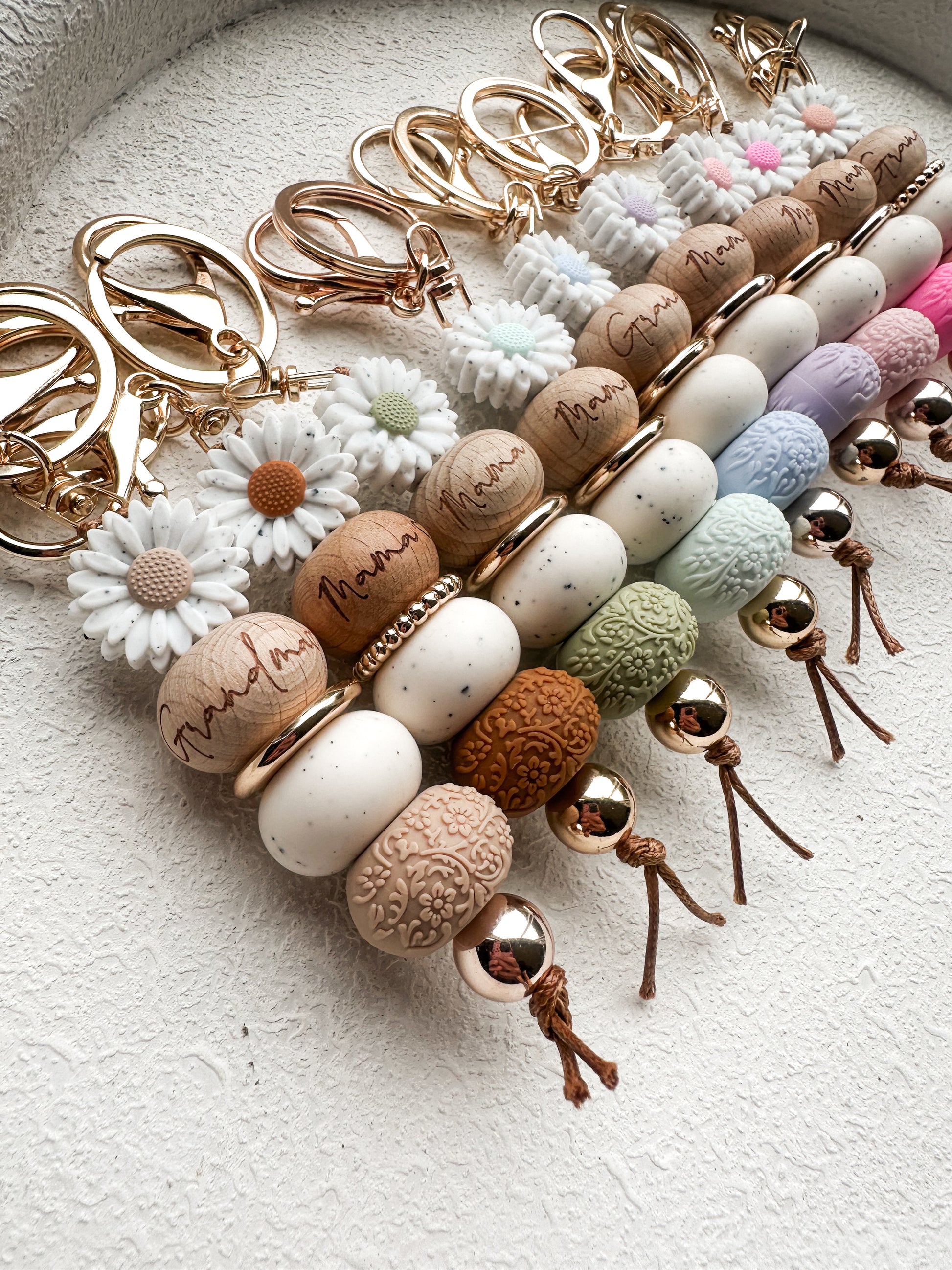 These are our stunning handmade keychains; made from high quality Silicone, acrylic & Beechwood beads.